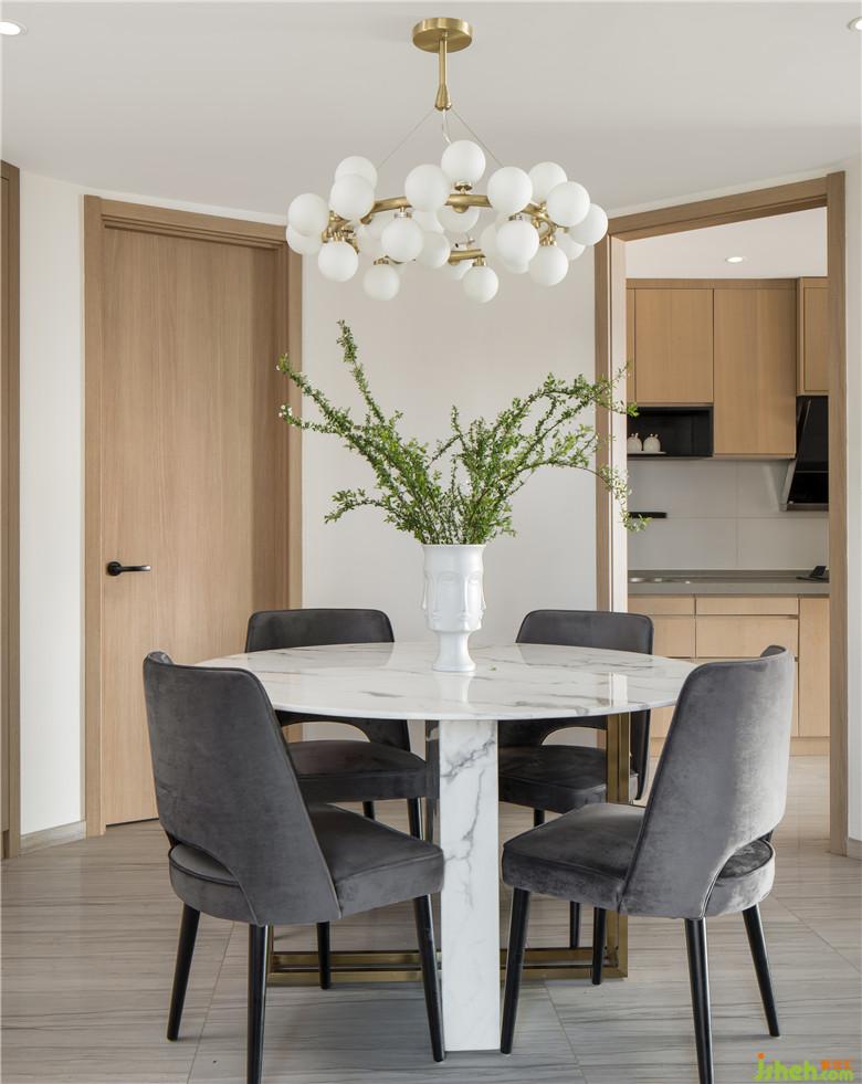 本案在入户长廊做了大胆的改动,室内设计师将原本的长廊改成圆形的餐厅,餐厅的四周用柜子砌成圆形,这样的改动首先打破了入户长形走廊带来的压抑感,其次满足了业主对圆形餐桌的需求。