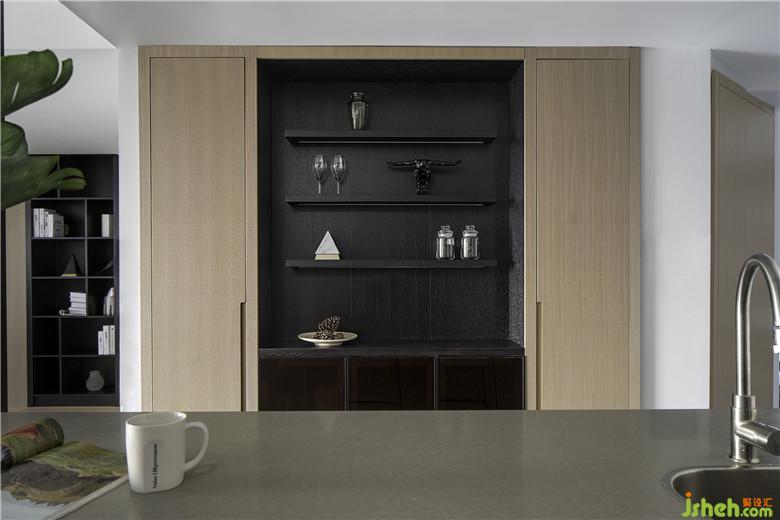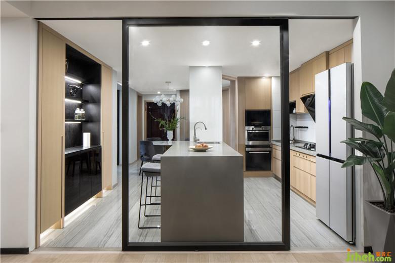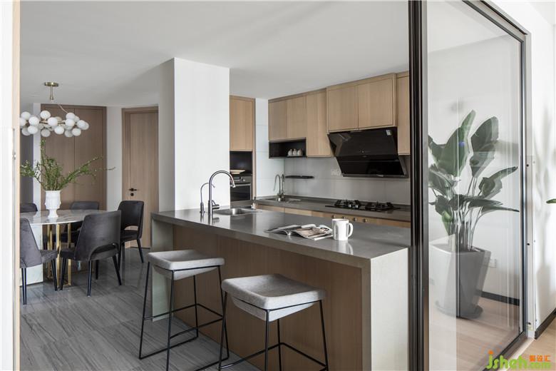 厨房和客厅之间设计玻璃大滑门,室内设计师这样的设计首先可以隔绝厨房的油烟其次让厨房的区域光线更加的充足明亮在视觉上使空间更加的通透。厨房的吧台以柱子而建即满足了业主对岛台的需求同时也避免了孤立的柱子给空间带来的尴尬局面。