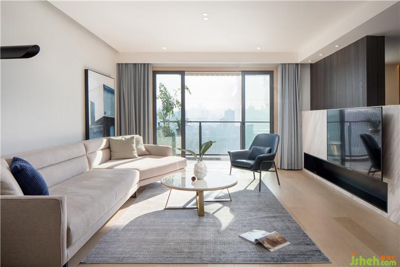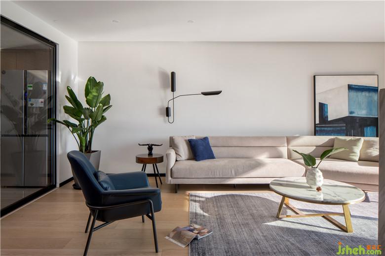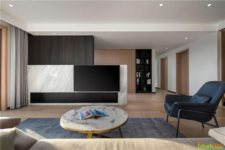 客厅的电视墙做了高低错落的设计在立面构图上美观大方,大理石和木饰面材质的综合运用给视觉带来了巨大的冲击力。电视柜的背面是亲子空间,坐在大理石电视柜背面的吧台上即可以照顾孩子也可以跟客厅的人有所的交流,室内设计师这样的设计给业主的生活带来了极大的便利性。