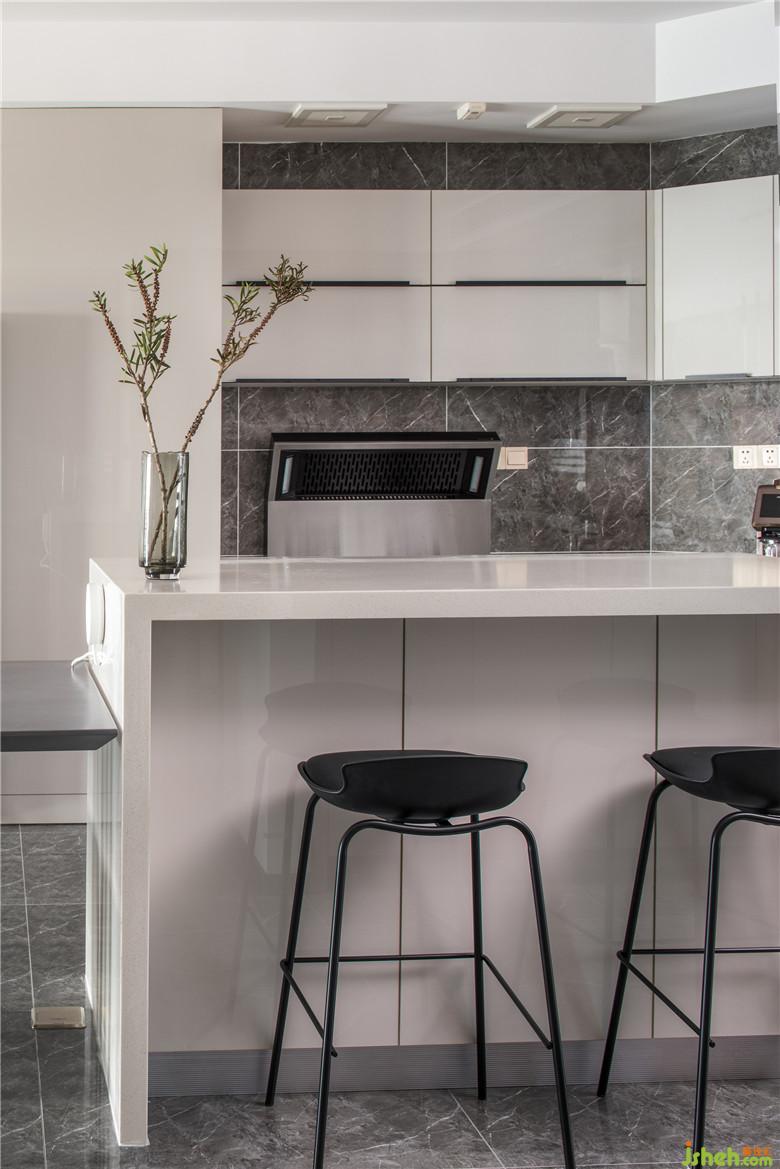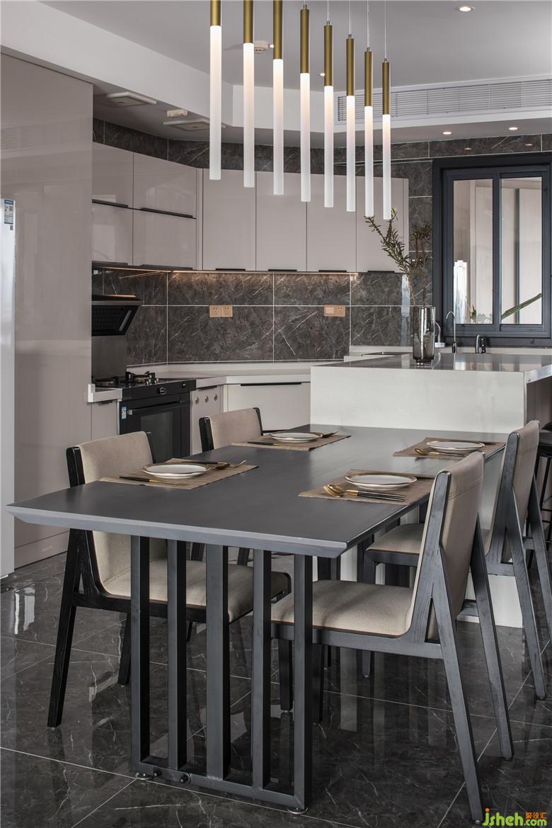 原来的厨房没有什么采光,室内设计师在布局上考虑了开放式厨房加岛台的操作形式,客餐厅做在一起增加了公共空间的面积也为屋主增加了更多的活动空间。将厨房的洗手盆考虑在靠窗的位置增加采光的同时也方便使用。