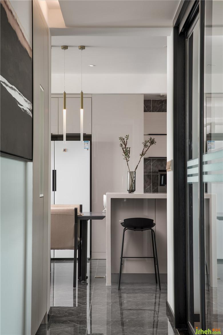 方案在玄关处设置杂物间满足业主的储物空间,入户花园作为健身娱乐空间透过进厨房的玻璃门跟客餐厅有很好的互动和交流,同时也增加了厨房的采光和通风。