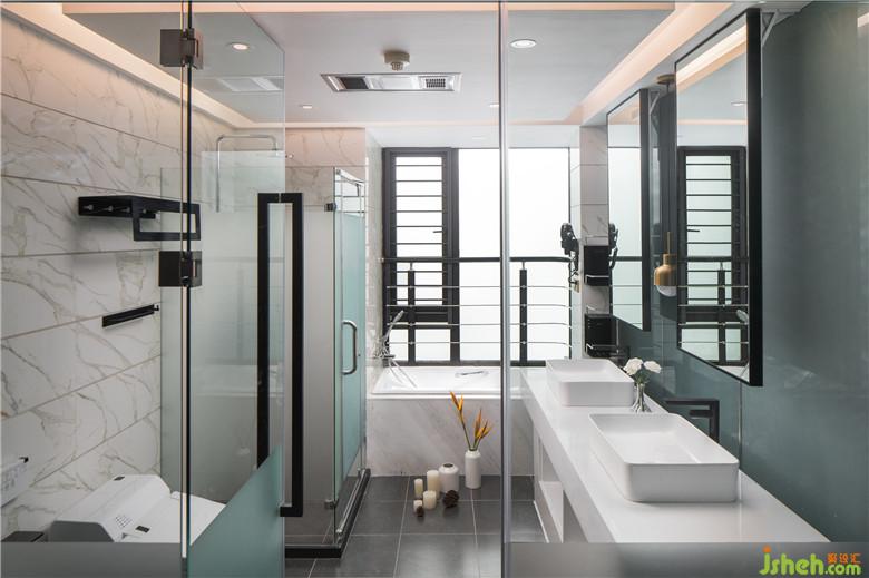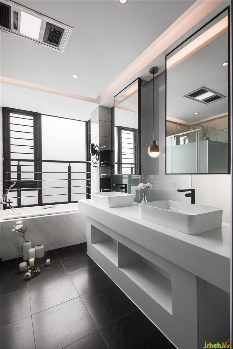 卫生间设计了双台盆满足两个人同时使用,浴缸设在靠窗的位置方便屋主欣赏窗外的江景别有一番趣味。