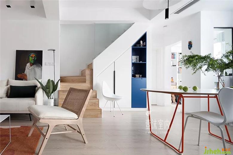 楼梯位于客厅与餐厅之间,通过楼梯可以到达二楼主卧室空间,楼梯下方的餐边柜用了一抹低调的克莱因蓝作为点缀,与地面、家具的大地色(暖色)系相互补。