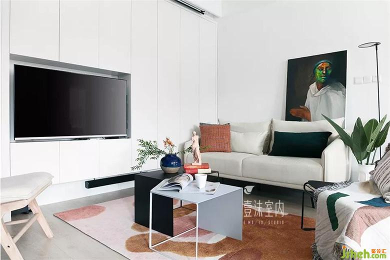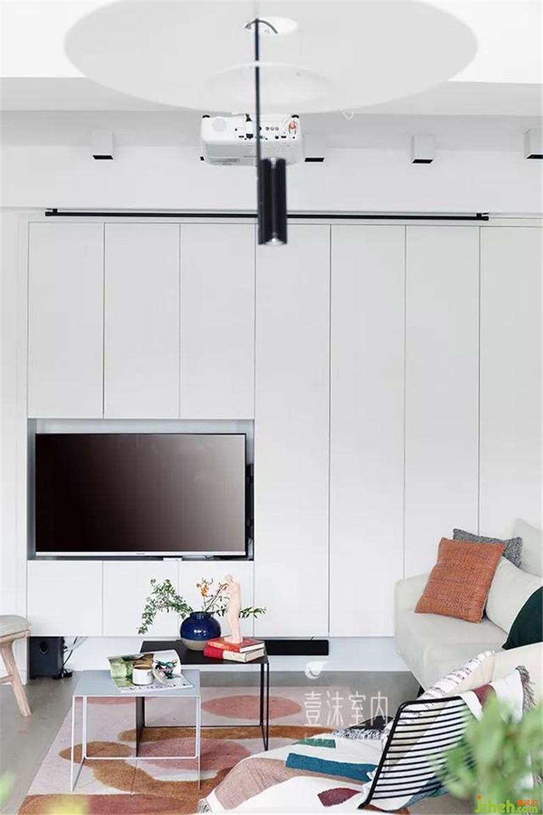 1、客厅同时考虑了电视机与投影,因公共空间储物有限,客厅增加了一面储物柜,电视嵌入到储物柜内部,考虑到在客厅看电视与玩游戏的舒适性,在电视背后增加了旋转支架,全家需要看电视或者老公需要玩游戏的时候可以将旋转支架旋转90度正对客厅沙发。