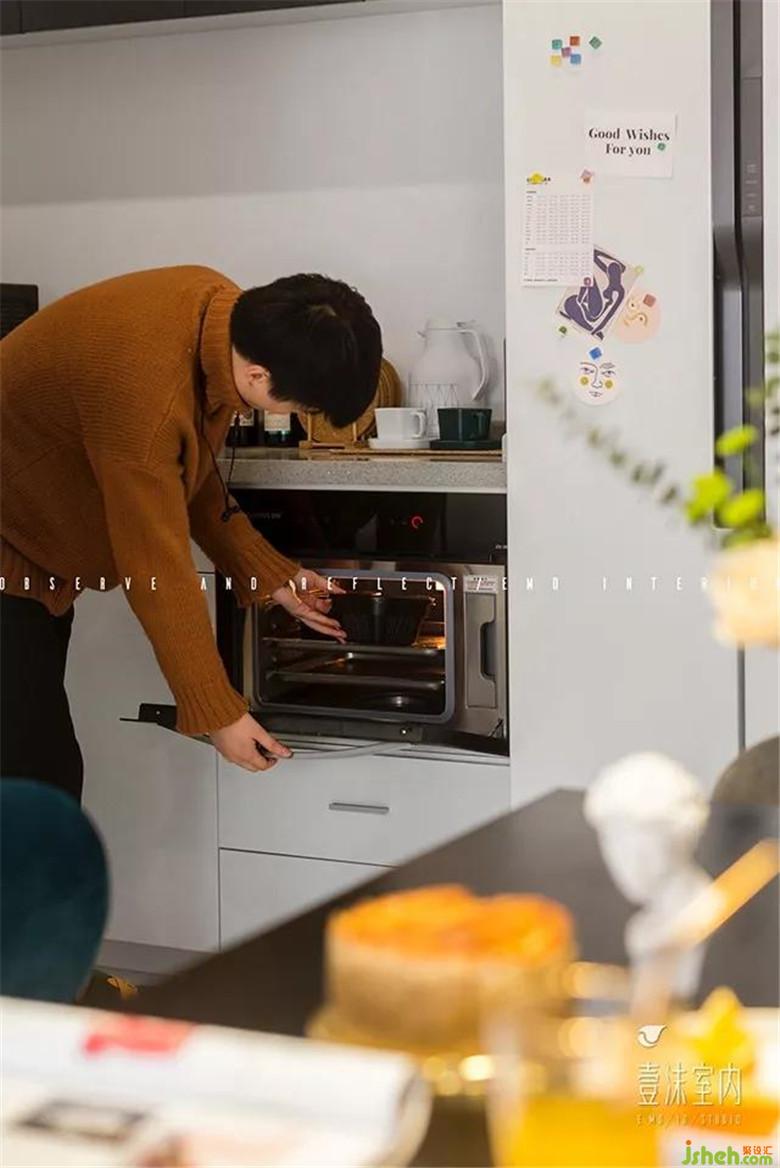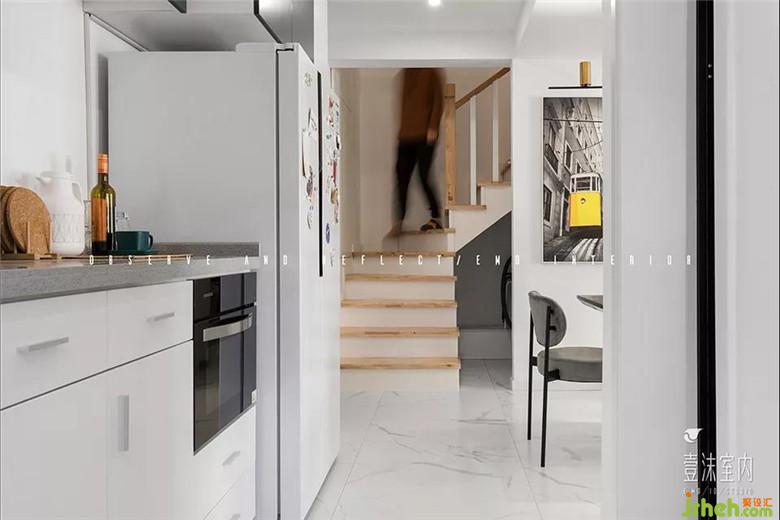 入户设计西厨满足业主对高品质生活的追求,中厨厨房设计玻璃滑门即满足了厨房的采光也可以很好的隔绝厨房的油烟,将楼梯设计在原来厨房的位置跟现在的厨房门形成对称的门洞使客厅空间更规整严谨。