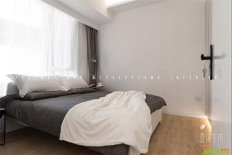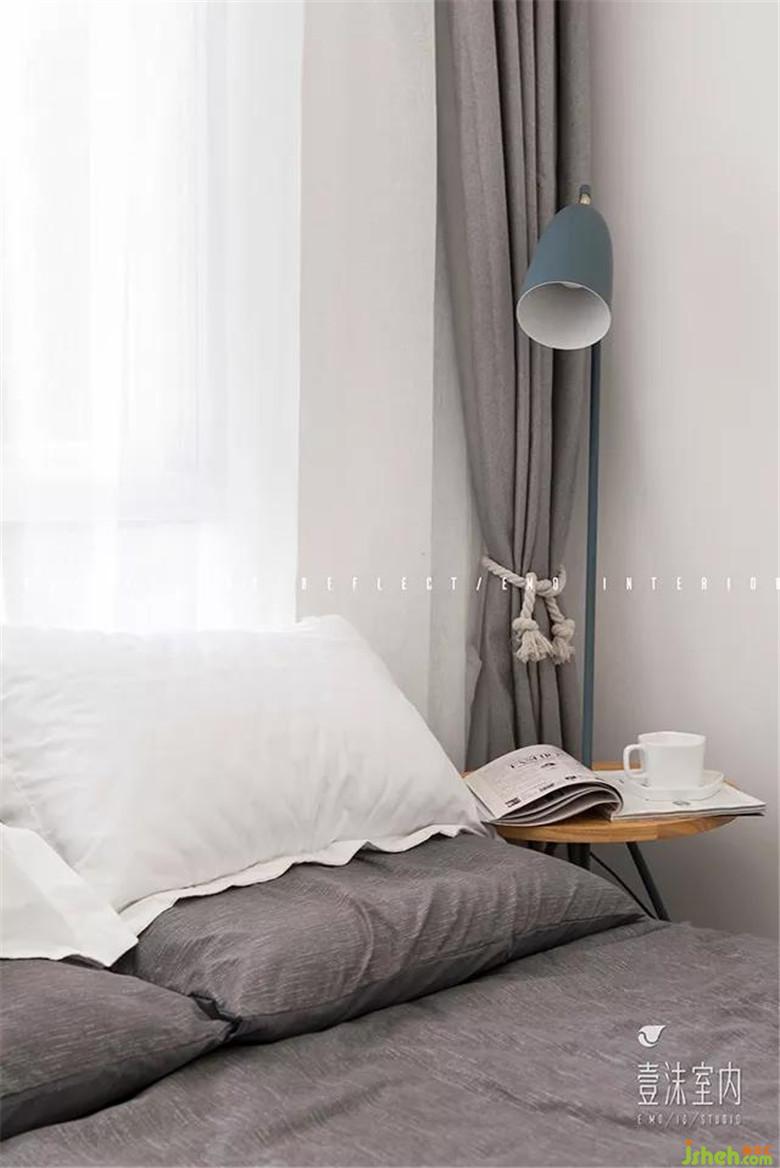 老人房用棉麻质感的面料装饰,深灰的颜色内敛而深沉有助于老人快速睡眠,基装以白色调为主搭配原木色的木地板简单却不失温馨。
