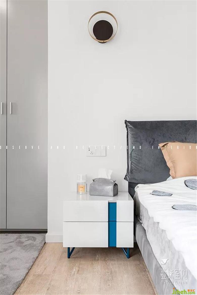 主卧室跟开放式的书房之间采用玻璃滑门以增加书房位置的采光同时也使空间更加的通透。主卧室里面小房间的墙体被打掉后做成衣帽间增加了主卧室的使用面积。主卧用蓝色点缀使空间更加的清新,局部金色的运用增加了空间的质感。