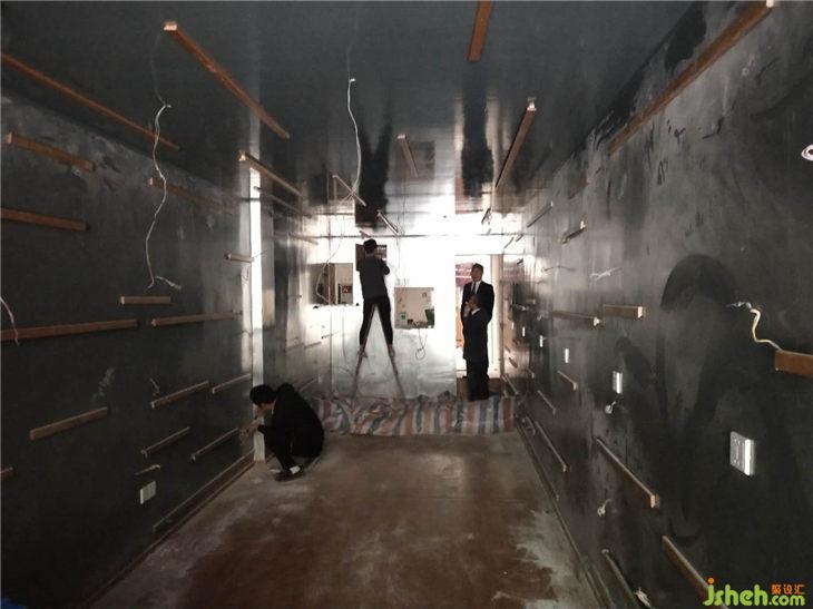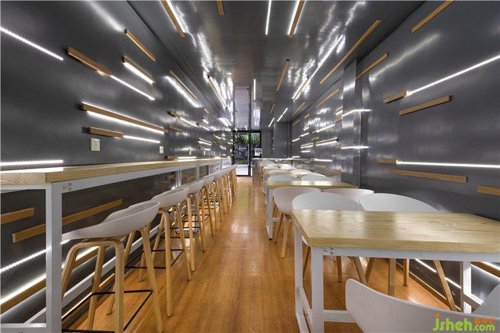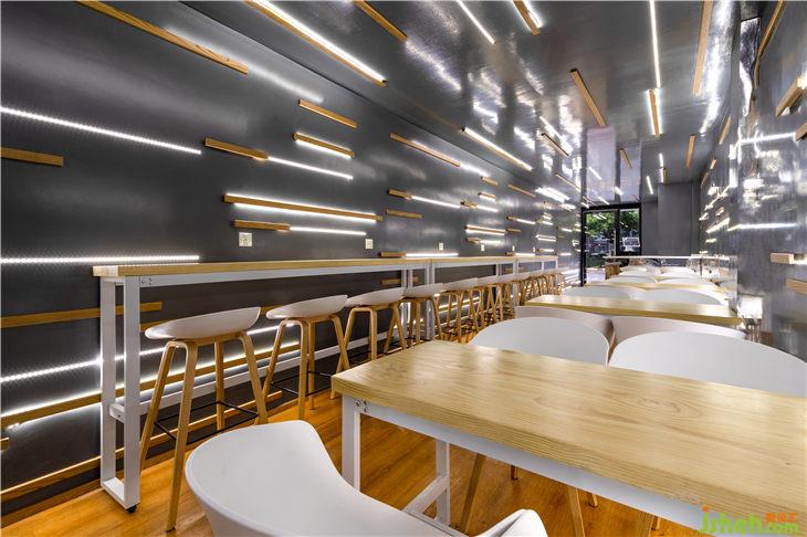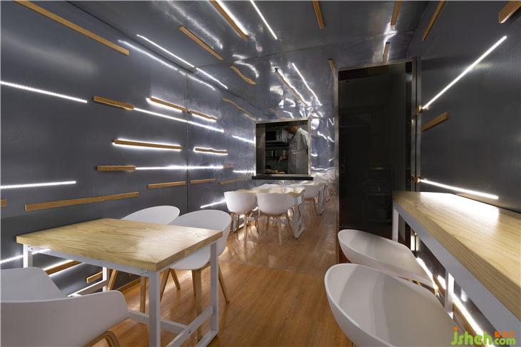 但为满足较为良好的用餐体验,并且增加空间的横向宽度,使之又不至于太过深邃压抑。在经费有限的条件下,设计师摒弃使用镜面材质而尝试用在墙面上涂刷价格较为低廉的环氧树脂漆创造反射与发光感的空间界面,漫反射带来类似磨砂的质感又不至于使光线反射过于强烈而引起不适。同时在柜台、厨房与就餐空间的分隔面等非墙面界面则使用镜面亚克力使空间形成一个镜面反射的整体同时增强空间的纵深感。空间界面之间的界限模糊,很好地增加了空间的开阔性。