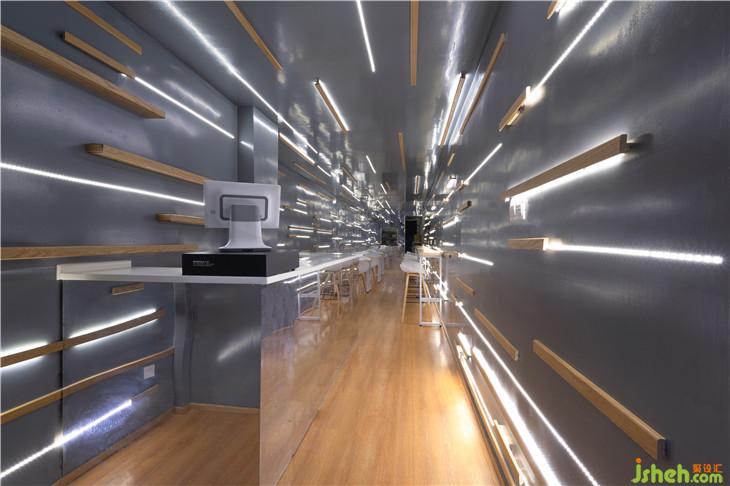 设计师在设计之前对菜品的品尝以及与大厨的聊天中,逐渐形成了味觉时光隧道的设计概念:在围合的墙面和顶面上均安装水平的线条——为增加墙面的多样丰富性和飞逝的效果。采用了木条和LED灯带两种材料的三种组合,在强调速度,促进一波又一波用餐者的更迭的同时,又强调出“隧道”极佳的延伸与进深感,以及光线为空间带来的流动感和活力。