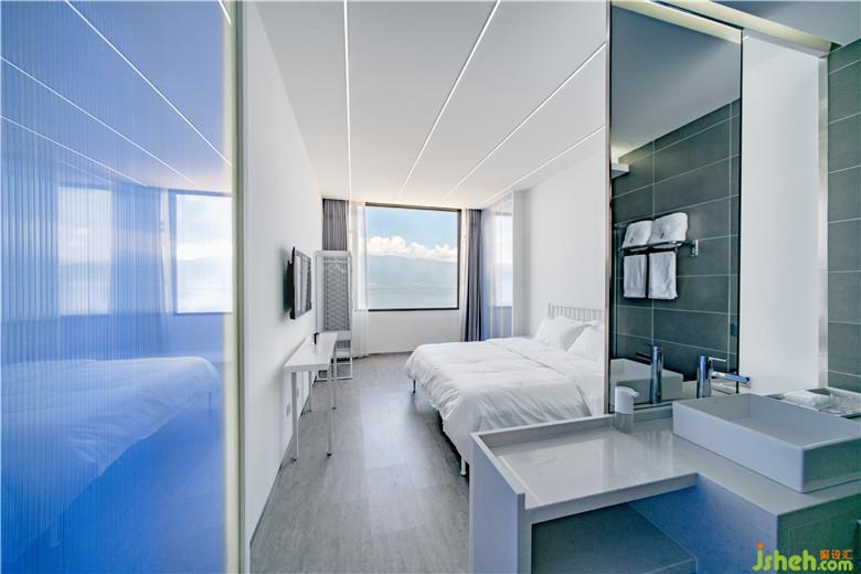 作为项目主体的浪漫自有其约定俗成的环境氛围,朦胧感及变幻的光影即是浪漫的环境所需要的属性。房间内的核心回归到更为常规的床与相关的居住功能,外界的朦胧以及空间的压缩正是伴侣间所需的情欲催化。独立设置的家庭影院则营造了不受打扰的电影约会体验。浪漫的洱海,朦胧的光线,神秘的色彩,创造出一个独属二人的神秘环境。床,置物架与长桌在整个空间中形成互动,在灯光下仿佛一切都在低声耳语,诉尽伴侣间的情丝。