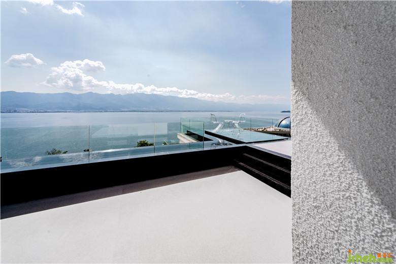 屋顶露台主要为拍摄所用及享用下午茶的绝妙之处。远处的洱海在玻璃的反射下,天光湖水共一色,人仿佛悬在空中,享受人间这一湾清澈的湖水。整个台面只在中间区域做了镜面,而沿露台有完整的一道水面去反射天光,深黑的池底与水面形成的反射,同镜面形成的反射有着微妙的差异,镜面,水面,洱海与天空,四个不同的景色同时起舞形成特别的休闲环境。