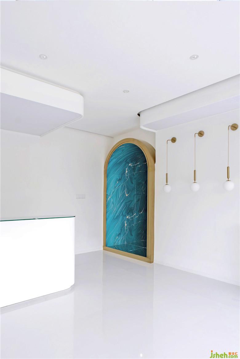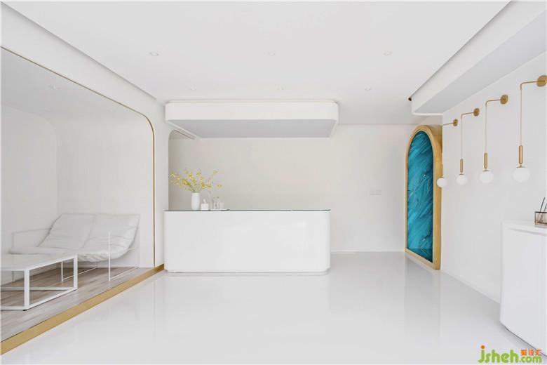 室内设计师选取采用枝状空间布局,仅用一个“T”字形的过道作为交通过渡空间,最大程度地缩短交通流线,减少交通空间的占用面积,释放空间,从而为大厅接待、等候、休闲等公共功能提供更为充裕的面积条件,在各个功能区块形成集中式开敞空间,整体空间组织秩序井然。