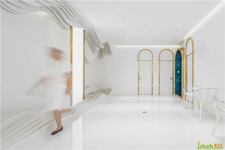 作为“秘境”的延伸,加强对山水之境的渲染,室内设计师在休闲区采用了大量的波浪形雕塑,它们有的从天花板上垂挂而下,有的矗立在地面上,层层叠叠,而每一层的线形又富于柔和的起伏变化,极具层次感。它们是山的意象又是水的幻化。