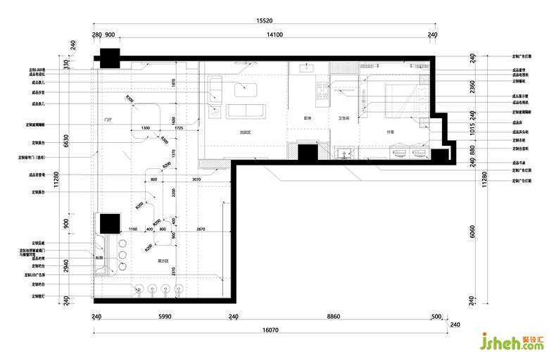 由于空间面积有限且平面本身形状较为特殊,依照传统家居体验馆模拟真实家居环境的模式极易造成功能分布混乱且尺度失调。其次,考虑到体验者各自的家庭内饰风格、个性、审美特质等等均存在差异性,尝试模拟真实环境的设计反而容易适得其反,产生陌生疏离感。因此,布局上将单个家居场景与线性的体验流线相结合,按照私密性由弱到强的顺序,依次从外而内布置客厅、厨房、洗手间、卧室,使顾客得以在场景模块间“穿梭”,不同场景中的各个产品的特性、优势及使用方法也随之得到理性且明确的传达。