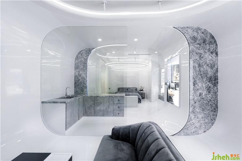 场景体验区地面抬高两级台阶,构建领域感与进入的仪式感。展示单元间以电控玻璃做隔断,因而店员可在客厅处通过功能总控面板向顾客演示全套产品的一体化联动效果。