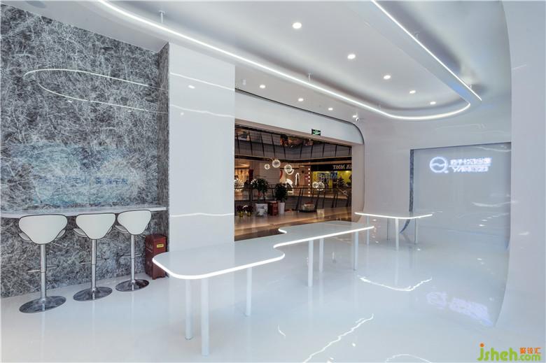 吧台洽谈区主要针对购买意向较强顾客,用于顾客与店员深入交流产品信息及购买意向。吧台置于平面一角,借助橱窗的遮挡,在店内创造了一处相对私密的空间。