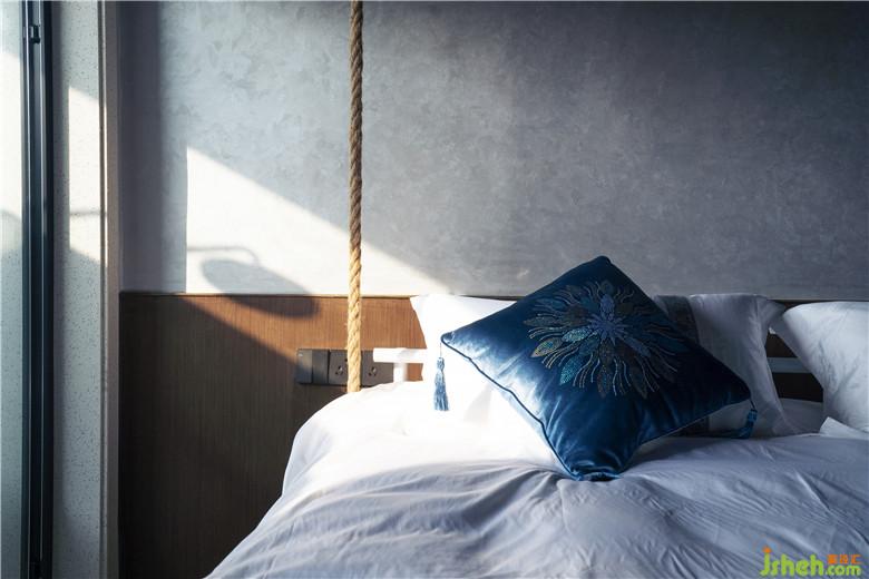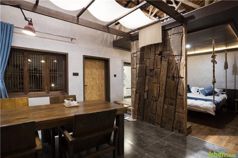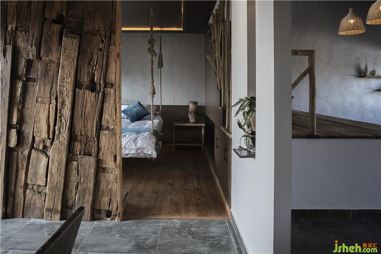 材料与乡野元素运用:入户秋千、绳垂挂下的沙发吊床是心归田园的悸动;质感斑驳的浅灰色艺术墙漆结合古朴的老榆木装饰,餐桌区顶部纱幔自木架悬挂来,整体透出如置身乡间的野趣,飘渺悠闲,古朴静谧。用朴素的材料组合打造出了素雅且极具辨识度空间。酒店设计