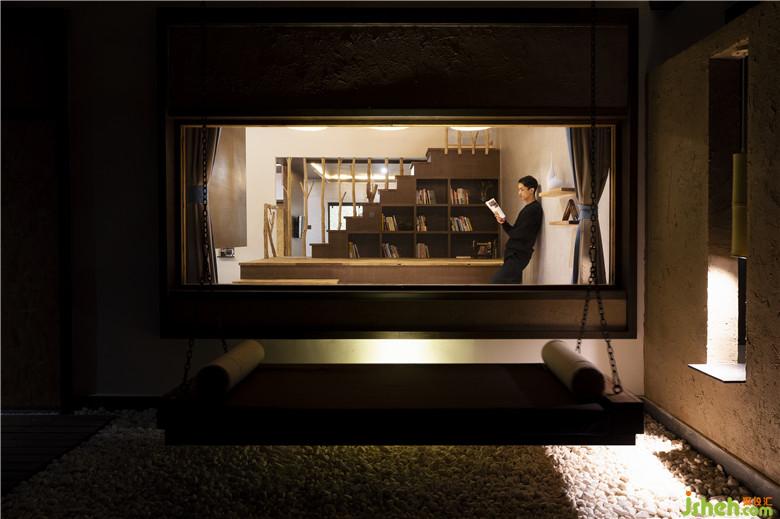 我们试图构建空间的延续性和整体性,以打破传统室内“房间”限制的壁垒。建筑内部没有一处完全封闭的功能性空间,“似断非断”格挡设计代替了“门”:从一层就餐区透过衣架可若隐若现地窥探到卧室;卧室与阅读区通过的原始的树干木栏间隔限定空间的同时又保持了视线一定程度上的通透性;榻榻米式的茶艺区与客厅空间得以相互借景。