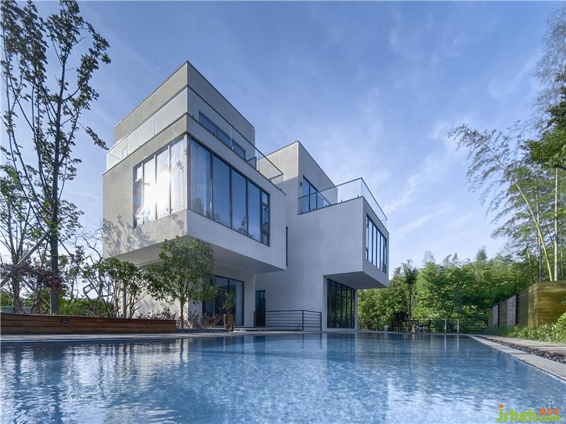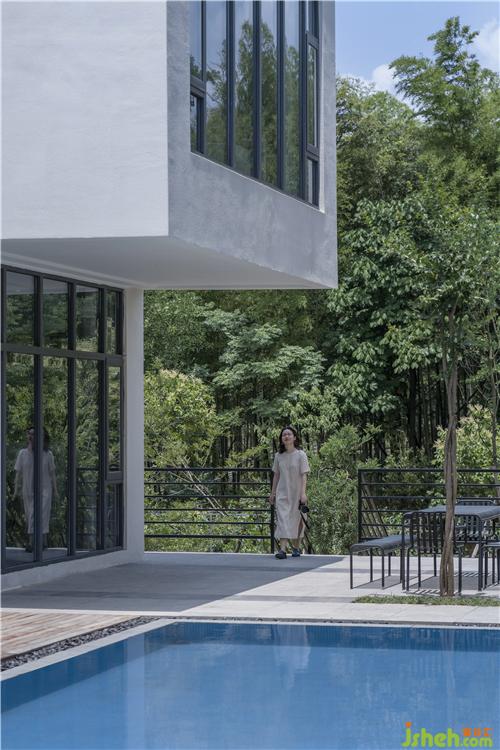 建筑通体呈现简约的白色,通过方盒子的穿插组合、形体上的退让或出挑,不仅丰富空间类型,获得更多能够亲近自然的灰空间,又能保持整体纯粹的建筑形式。最终让建筑既融入在这片绿意盎然,又引人注目:建筑、远山、竹林、流水共同构建出了现代人所向往的诗意栖居生活,朴素、自然、闲适。民宿设计