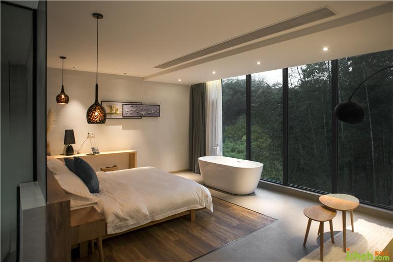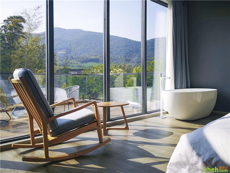 在二、三层的客房,设计师根据每间客房所处方位与周边自然条件,采用了朝向不同景观的大面积转角落地窗。民宿设计