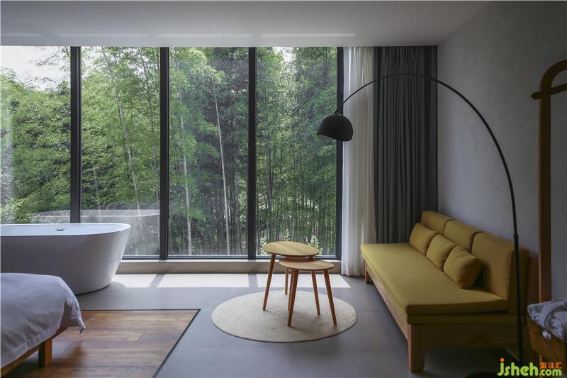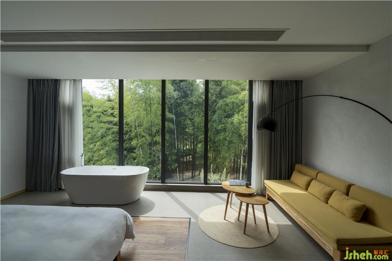 同时,每间客房的主题与其观赏到的不同景观(溪涧、远山、茂密的竹林等)呼应,这将不同的自然景观如同画卷一般完整地在住客眼前展开,建筑内部实现了对自然景色最大化的吸纳,“探溪”“沐阳”“摇竹”等别致的房间名也由此得来。