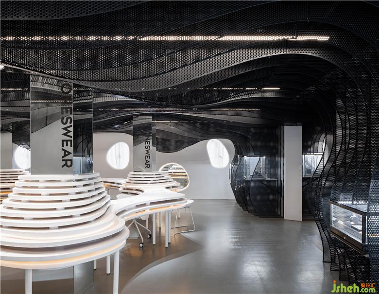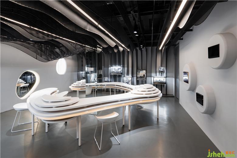 The design of the whole space starts at the exhibition space. The designer directly combines showcases and walls, leaving much room for streamlined artwork for exhibition at the center. The wall is made up of perforated boards which are cut into curved surfaces in pieces and has relatively strong ability of fire-proof.