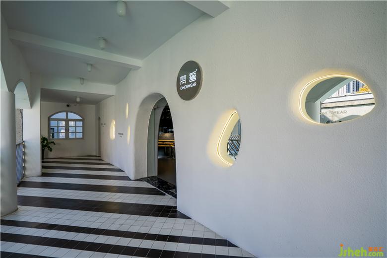 外墙面用真石漆刷成素白色,门的造型呼应洞穴概念。几个形态不一的流线型曲面造型的窗户在周围线性灯带的均匀的照射下泛着温暖的色彩,使空间视觉更具穿透性与连贯性,同时这些洞穴造型为新加厚突出装饰层打洞做出的效果,对原有墙面不会产生破坏。