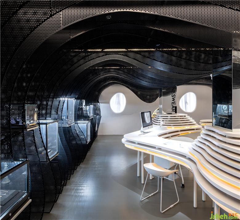 The curves are involved in the whole structure and appearance: the walls that used to be placed with full of square multimedia televisions are adapted to the continuous curved flakes which visually soften the edges of the televisions and showcases by embedding them in the shape of curves. The dark-gray curved and detached walls integrate with showcases makes a nature transition, a simulation of rocky coastlines in holes and caves. At the same time, the design meets the need of jewelry exhibition, improve space utilization and creates a visual sense of flow inside the space.