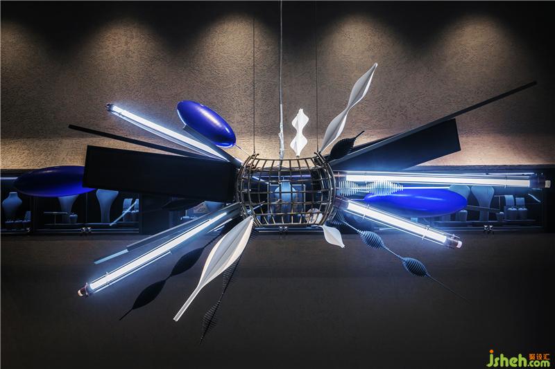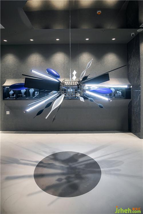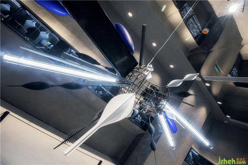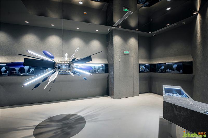 跨越时空的记忆被触发,平行时空,虚假宇宙,头脑风暴,脑海里重塑着无数的瞬间。树枝代表着生命的诞生,灯带等象征着思维爆炸的动态过程。武汉店铺设计三个橄榄形的装置为克莱因蓝色,由此可以让人联想到著名的无定向空间“克莱因瓶”,克莱因瓶没有里外之分,它的表面不会终结,即代表着无限的空间,也象征着珠宝背后无限、没有终点的爱情。