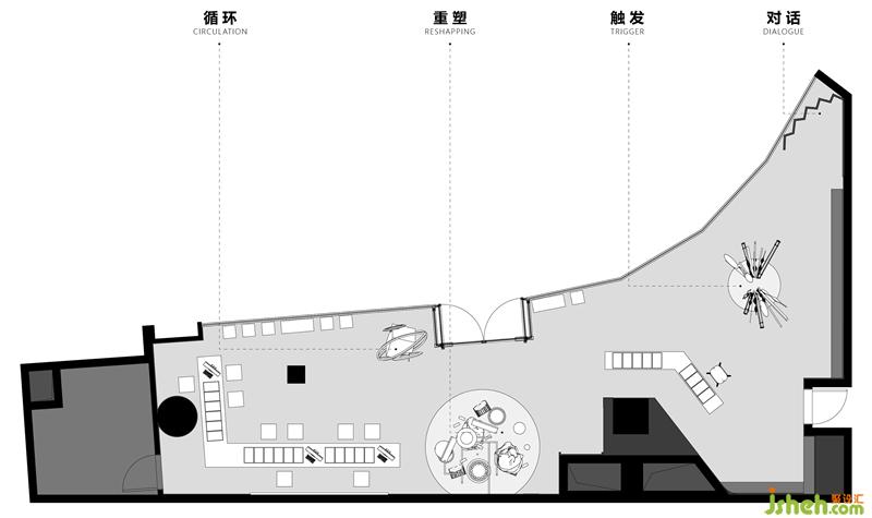 对于人类而言, 遗忘一直是常态, 而记忆是例外。在这个不断发展日益更新的数字时代下,设计师通过对话、触发、重塑、循环这四个阶段进行故事的叙述和延展,将空间作为容器,承载并引导着故事的发生,并激发出消费者与空间的相互关系。在这里,独具匠心的打卡装置、深灰色的墙面、闪耀夺目的珠宝乃至消费者们,都找到了最适合自己的位置。记忆重塑,故事开启,一眼瞬间,一念永恒。