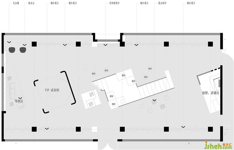 我们需要改造的空间是第三层的办公与展览空间的结合,空间改造的重点及难点正是基于现有空间特质难以展示婚纱高档的质感,需要对空间进行重新梳理,让婚纱的品质及试衣的仪式感在此体现,将品牌的形象进行充分展示,并针对嫁衣的概念进行重新梳理,试图将“嫁衣”从人生阶段的仪式感表达中转译到空间之中。