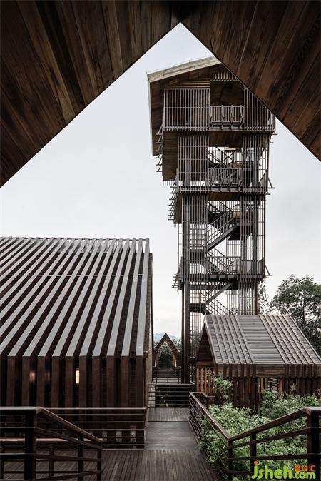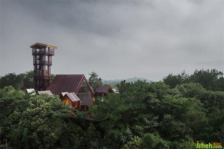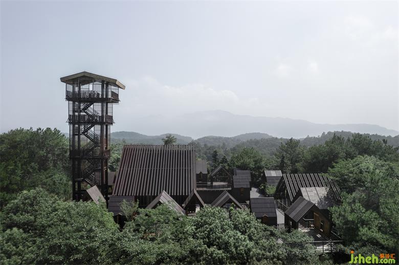 设计包含一座24米高的瞭望塔,一个多功能大厅,以及19个预制森林木屋。