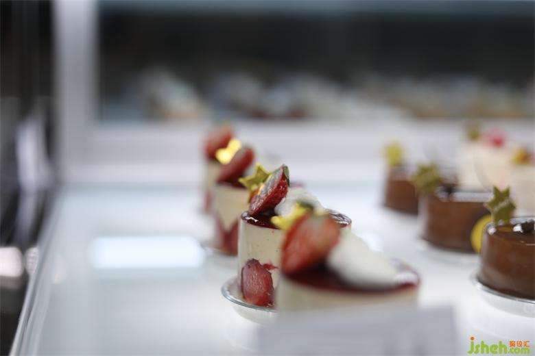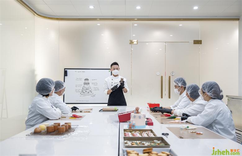 烘焙区域与吧台相对。体验厨房设计透过弧形长虹玻璃, 顾客在等待品尝新鲜甜品的同时,还可隐约看到烘培师们的制作过程。