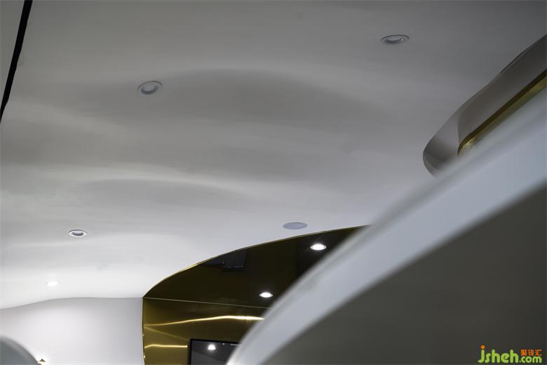 The golden highlights add a sense of luxury the space. The designer uses flattening techniques and brushed metal skills to bring the core concept into the design, which is extended along with the wall to the roof, and inert the metals into the wall, fully covering the bar and round corners.
