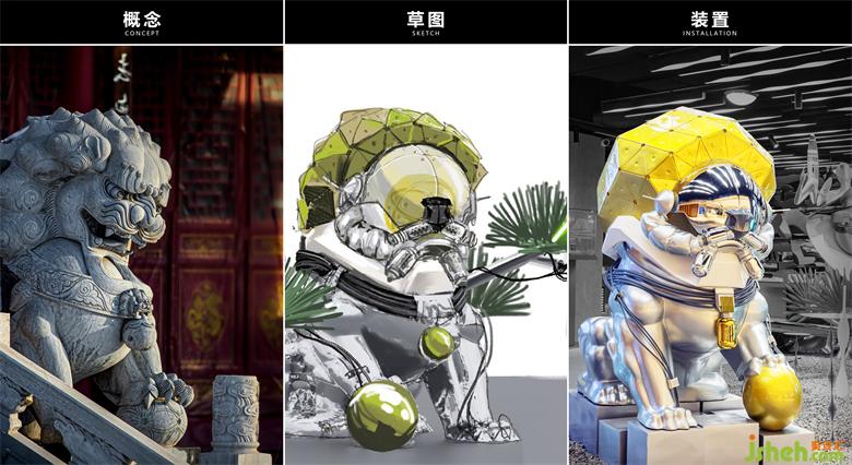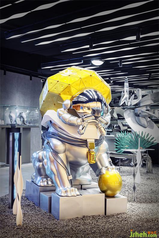 装置头部以拼接甲胄造型表达,面部采用电镀工艺的镜面反射球体,与金属元件管、充气囊、天线零件等富有科技感的“五官”结合;脖颈项圈改为数圈线缆,挂着品牌独特的胶囊戒指盒,并延伸到背后的松枝上;身体则采用玻璃纤维3D打印工艺整体成型。石狮子背后的绿色松枝用LED灯管制作成镭射激光松枝,结合连接的线缆,营造了电力光效。