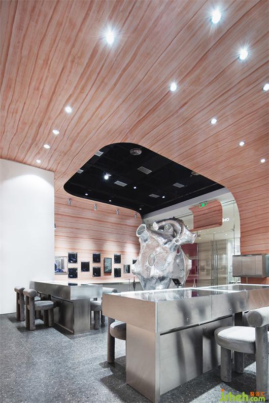 错落的入墙展柜打破常规,点缀在墙面上, Scattered inside showcases break the convention and embellished on the wall