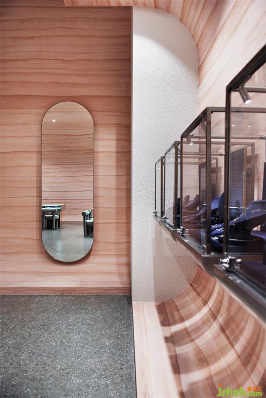 全身镜与墙面展柜互相映射,延续空间曲线, Full-length mirror and wall display cases are mapped to each other, extending the spatial curve