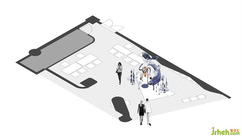 ▼双入口视线集中于空间中心的艺术装置,Thesight of two entrances focus on the art installation in the center of the space