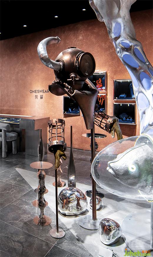 主体的造型通过3D打印实现,对质感的刻画则使用金属漆和涂料手动完成。长沙珠宝店设计装置周围散落着一些不锈钢制作的装饰,模拟海底环境。