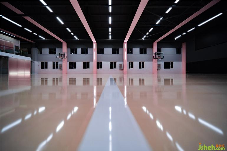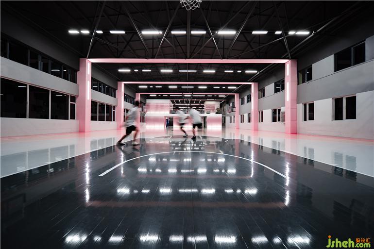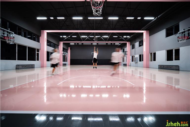 ▼室内采用黑色与粉色,配合橡木质地板等,创造一个有层次的空间,basketball court, using the neutral color tones, oak floor system to create an interior space with simple and elegant spatial layers © Yixiang Wang