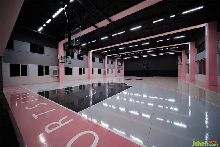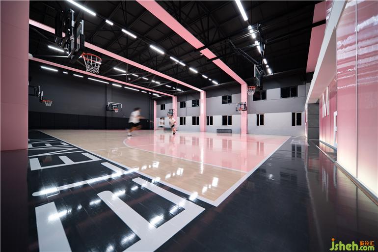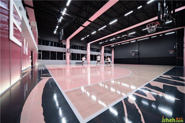 整体视觉色彩中,黑色粉色搭配带来强烈视觉冲击力,搭配中和了粉色稚嫩的感,凸显空间的沉稳与深邃,篮球馆设计平衡了粉红色带来的充满活力和快乐的感觉,创造出极致纯粹的空间观感。