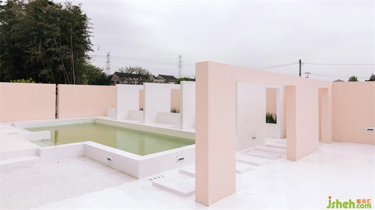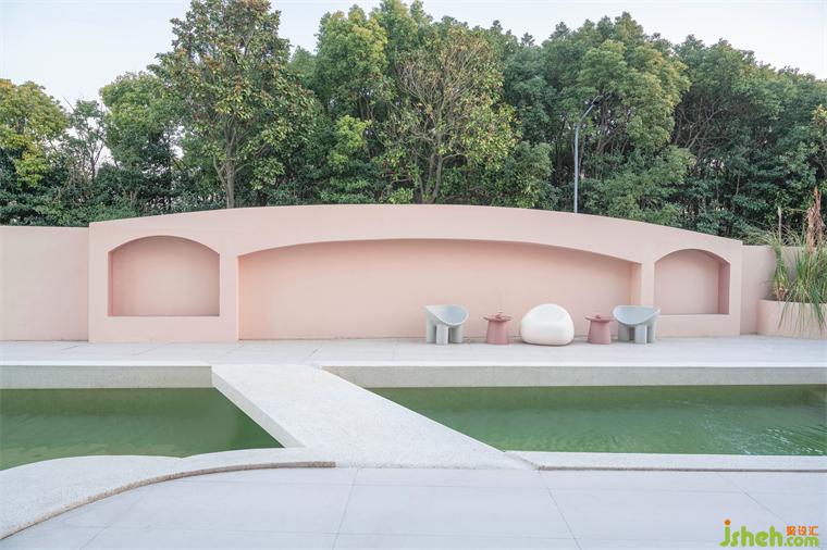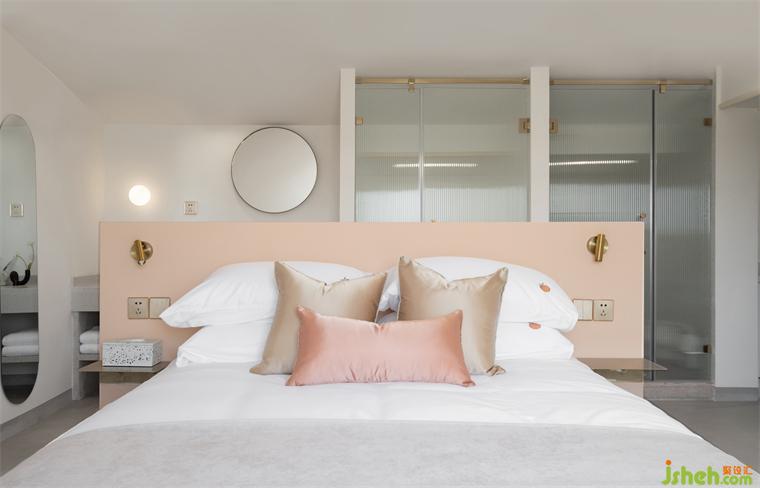 栖梦·花溪整体呈现为粉色,使用冷静的中性灰作为调和,精心调配的色块比例加以金色材质作为点缀。同时,花溪民宿改造设计硬装材料的选择也以坚硬感的材质为主,置入玻璃、金属、亚克力,辅以穿孔板、水磨石和微水泥等,再用布艺软装作为辅助,形成细腻刚硬的有机搭配。坚硬的材质下,温柔无处不在。不仅构建出如梦似幻的建筑空间,还展现出刚柔并济的特质。