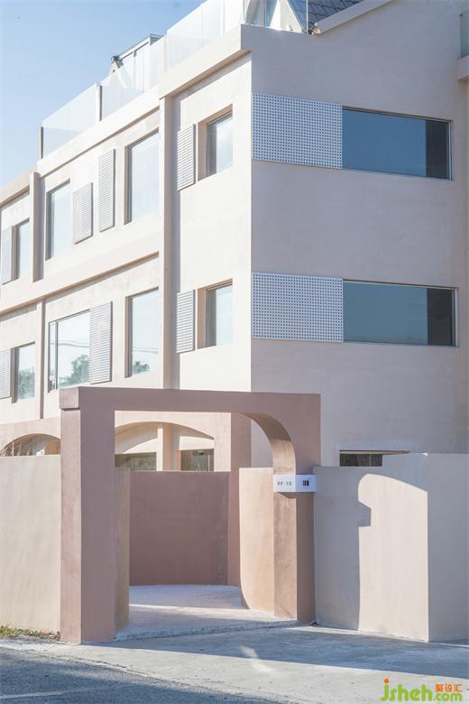 光之于空间,犹如空气之于生命,我们花溪民宿改造设计格外重视光影的营造。在整修室外空间时,首先对门窗进行重装,考虑到造价问题,我们没有对建筑外立面进行大的修改,只是做了拆除与粉刷,用大面积的粉色确立起整间民宿的视觉特征。在挑选外立面装饰时,十分注重“自然采光”的原则,用穿孔板形成块状感,巧妙地利用自然光线突出室内环境的层次,营造出斑驳陆离、明暗有致的视觉效果。