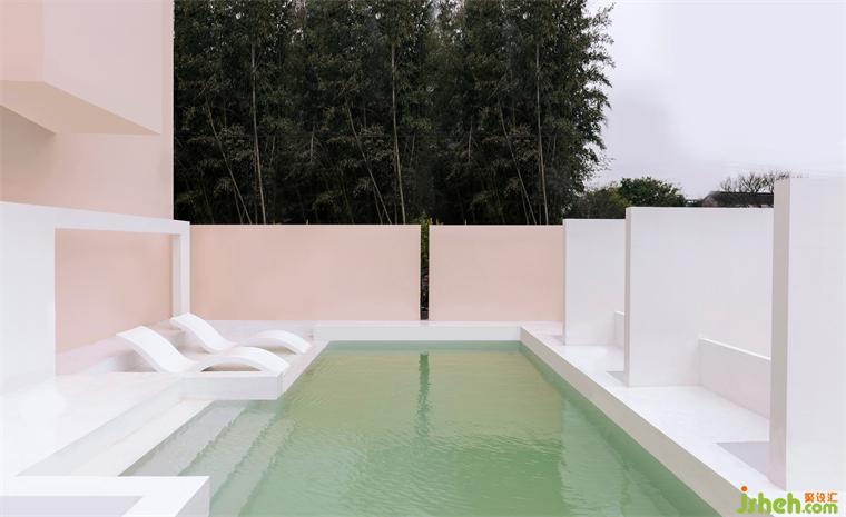 庭院内部的改造以两个泳池为中心进行设计,同时对照室内进行造景。水乃万物之源,有水就有了生命,甘冽清明的池水赋予了院子灵性,其流动的动态特质和周围静态的环境形成有机统一,令神秘与梦幻交织于此。泳池中穿插布置了台阶和下沉休息区,花溪民宿改造设计形成了多样化的趣味空间,让每个人都能找到属于自己的安静角落。