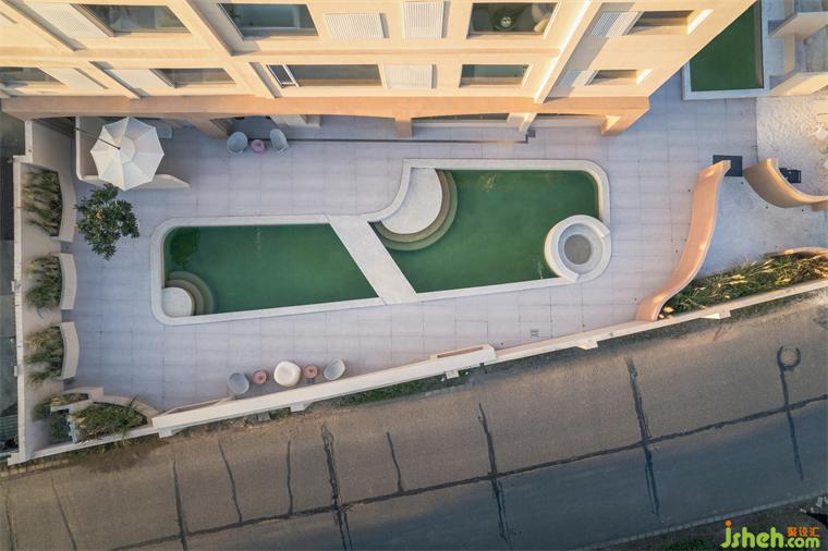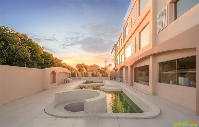 ▼从入口看向南侧泳池黄昏 ©徐英达