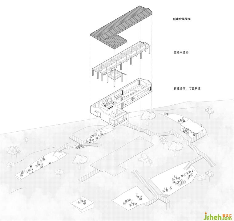 山系这一主题实际上是一个非常具有中国特色的命题。山系代表了中国传统人文情感的集中体现——追求避世之境。尽管在西方也存在隐士文化,但所谓的西方归隐是回归到原初状态,而中国的避世状态是身体虽远离尘嚣,但内心却追求更高层次的文化追求。这种状态很难以物质形式呈现,就如同王阳明所提到的“格物致知”:人性是无法改变的,而“意”与“行”之间存在着内在的联系。中国传统人文情感的核心思想或许就是追求这样的境界。因此,我们的愿景是在满足茶室基本功能需求的基础上,尽量简化并减少人们对物理空间的依赖,为使用者留出更多未被界定的、与自然融为一体的空间。这一点至关重要。因此,对环境的尊重与顺应成为我们方案的主要设计导向。山系茶室成为了人们进行“格物”的场所,这也正是我们建造它的初衷。