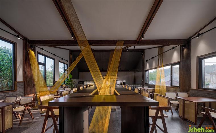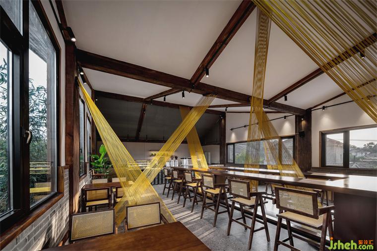 Unlike commercial spaces in the city, this design needed to decipher how to harmonize the commercial nature of the café with the cultural attributes of the history of the ancient village in the historical district. The café is on the second floor of the stagecoach station, so it needs a way to channel its commerce. The utilization of the open space on the first floor was our final choice. A beam-shaped installation made of nylon thread extends from the entrance on the second floor to the outdoor courtyard on the first floor, bringing the focus of the eye to the entrance on the second floor.