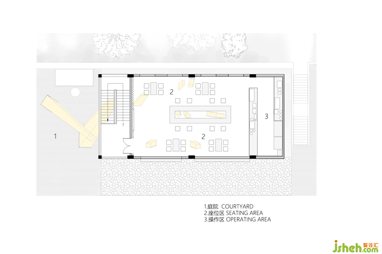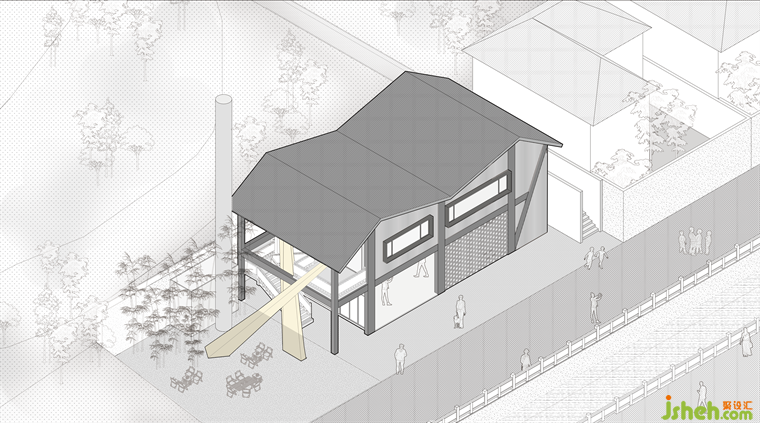 不同于城市中的商业空间,本咖啡厅设计需要解读在历史片区中,如何协调驿站茶饮空间的商业性和古村历史的文化属性。咖啡馆在驿站的二楼,因此需要一个方法,为其进行商业引导。而对一楼的露天空间的利用,则是我们最终的选择。用尼龙线制作的光束形状装置,从二楼入口处延伸至一层的室外庭院,将视线的焦点汇聚到二楼的入口。