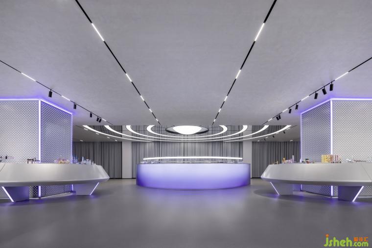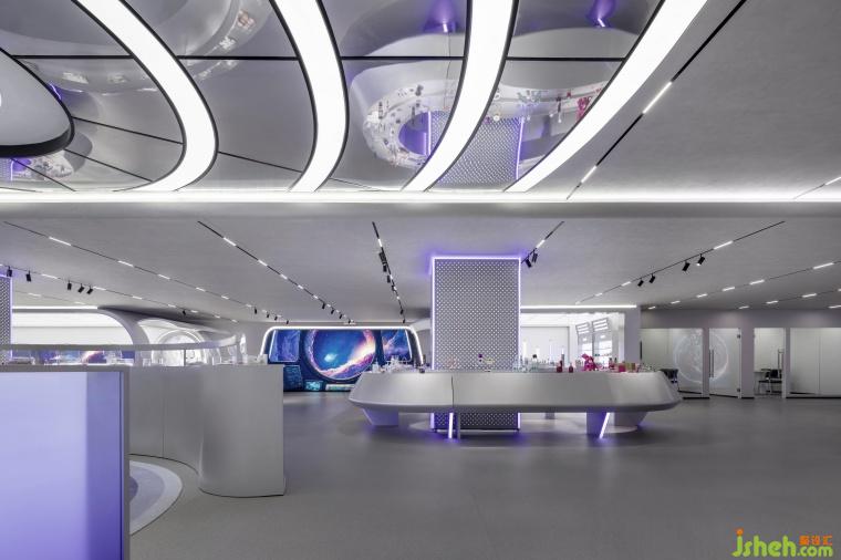 “天地玄黄,宇宙洪荒,日月盈昃,辰宿列张。”,人们从古至今,从未停止过对宇宙时空的探索,宇宙的未知性与神秘性使得它成为了人们对未来的探索路径之一。展示着广袤无垠宇宙的巨大显示屏,白紫相间的线性灯带犹如跳动着的不规则星系将旅客们从打开电梯门的一刻瞬间便拉入到未来时空的旅途当中。在安特未来灵感舱来一场穿越星际的未来探索,融入全新的科技元素,结合化妆品展厅打造了一个沉浸式未来风格的感官盛宴。