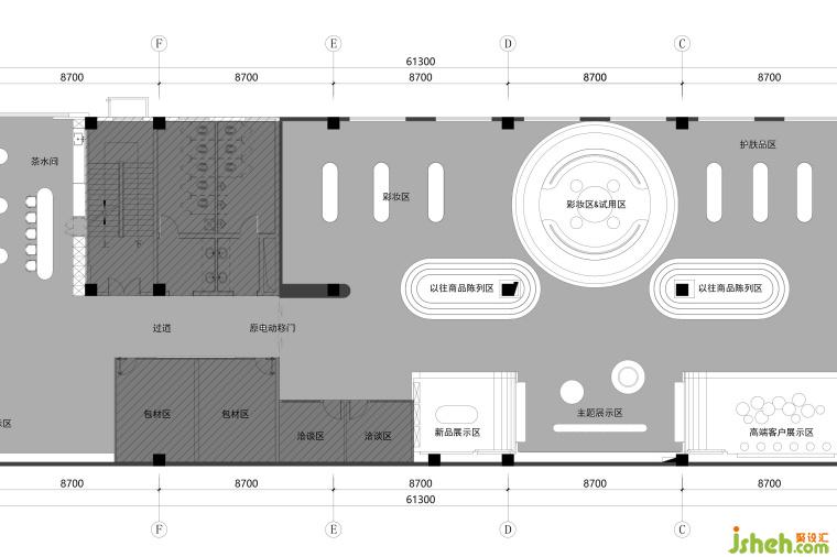 展厅总共分七块区域分别为彩妆区,以往商品陈列区,新品展示区,高端产品展示区,护肤品区试妆区和特展区。